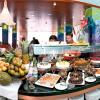 чипсы, сэндвичи в ассортименте (овощной, с курицей, с ветчиной и сыром), гамбургер с сыром, хот-дог, фрукты (в зависимости от сезона), выпечка в ассортименте, мороженое в стаканчиках и ежедневный бесплатный прокат